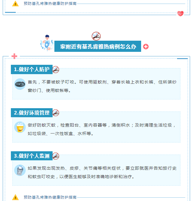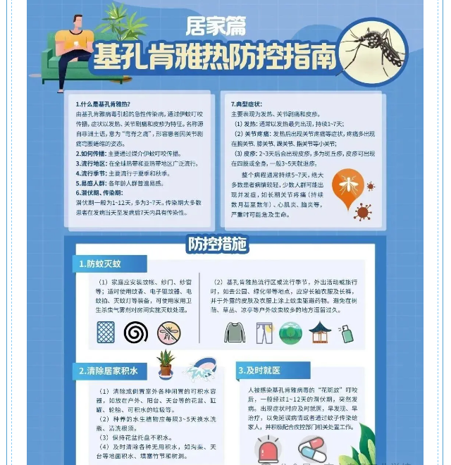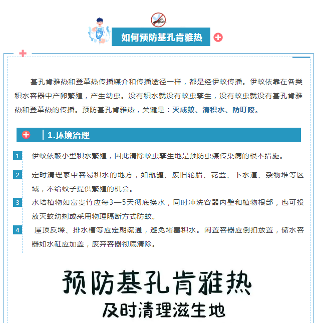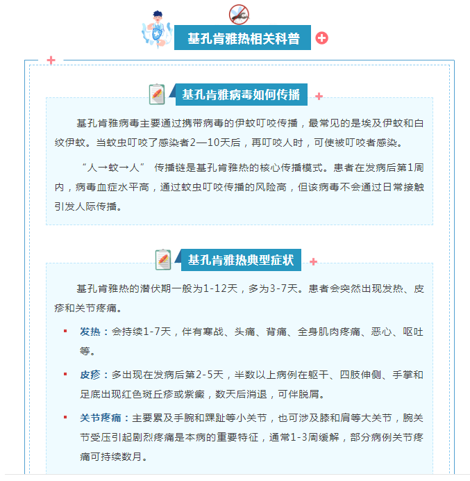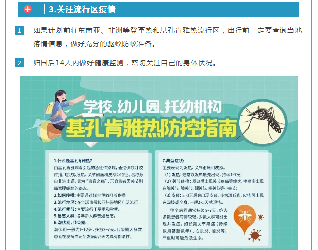 什么是基孔肯雅热? 基孔肯雅热是由基孔肯雅病毒引起,主要经伊蚊叮咬传播的病毒性传染病,早在1952年在非洲被发现,全球已有100多个国家报告过,在热带和亚热带地区广泛流行,主要发生在美洲、非洲、东南亚的部分地区。 预防基孔肯雅热健康防护指南