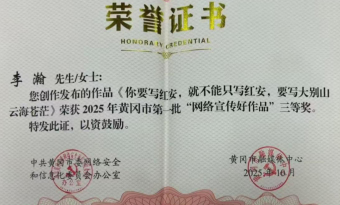 据悉,本次评选活动由黄冈市委网络安全和信息化委员会办公室、黄冈市融媒体中心联合举办,旨在鼓励和表彰一批弘扬主旋律、传播正能量、展现黄冈风貌的优秀网络作品,提升网络内容质量,清朗网络空间。经过严格评审,李瀚的作品以其独特的视角、真挚的情感和富有感染力的文字表达,在众多参评作品中获得认可。