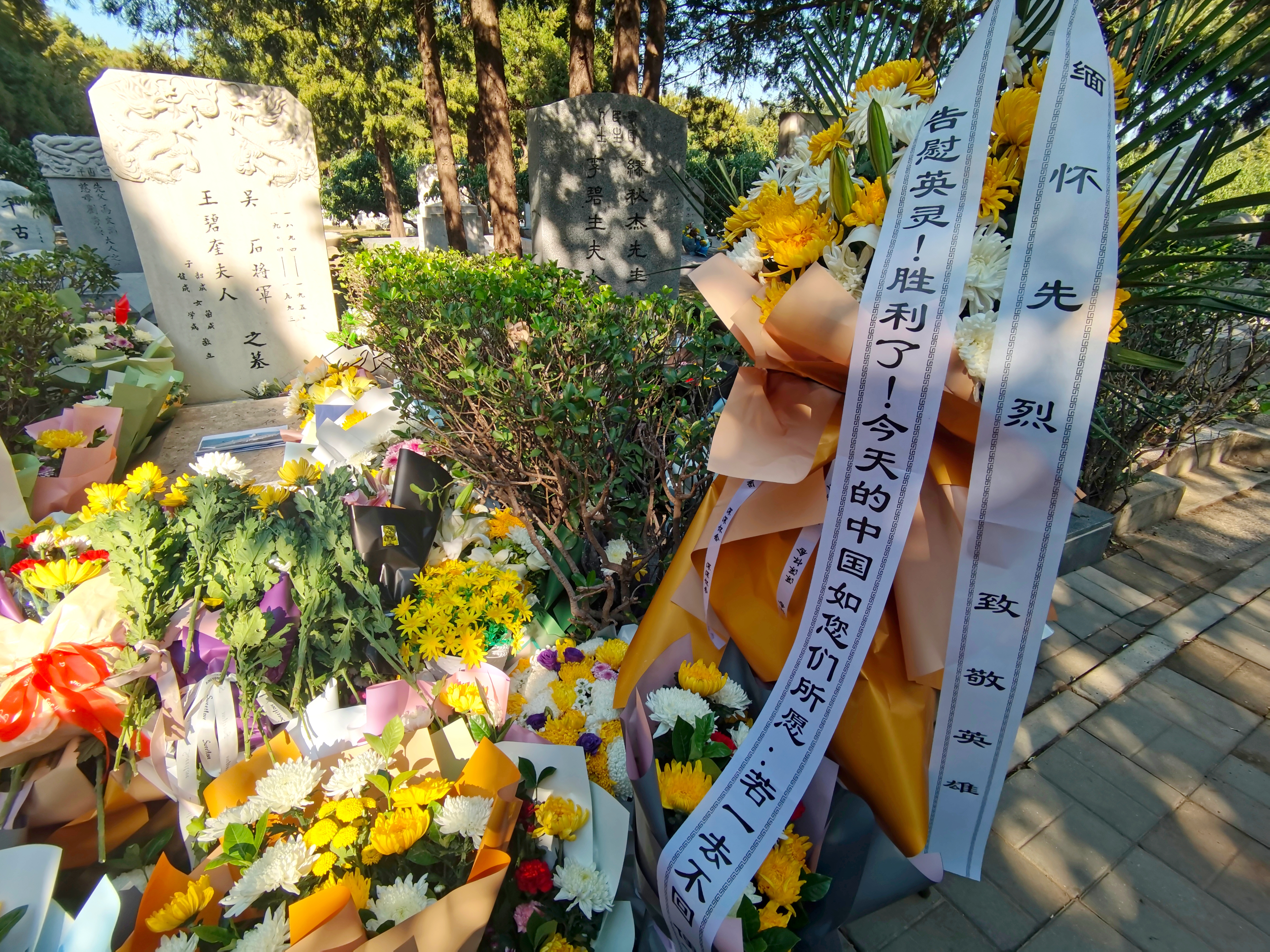 一束束鲜花、一个个花篮,写满了对沉默英烈的怀念。一个花篮的缎带上写着“缅怀先烈 致敬英雄”,“告慰英灵!胜利了!今天的中国如您所愿!”更多写的是“深深怀念”。不知谁在墓前放着九三阅兵、福建舰、舰载机弹射起飞三张彩色照片,这是告慰英雄,我们的祖国变得强大了;一张白纸上“台湾必归,‘沉默的荣耀’照耀现实”黑色大字,表达了百姓心底的夙愿 鲜花丛中飘扬的五星红旗,象征着回家真的不远了。