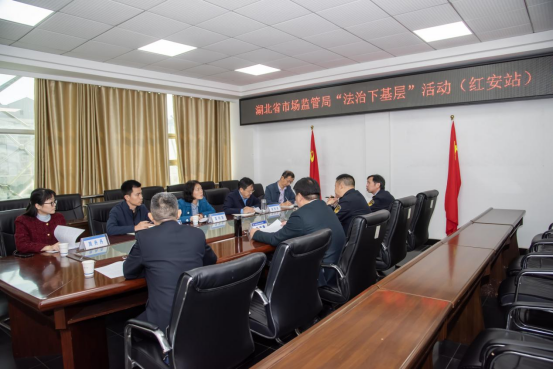 红安网消息 11月13日,湖北省市场监督管理局“法治下基层”活动(红安站)在红安县市场监督管理局成功举行。湖北省市场监督管理局政策法规处夏利容处长、一级主任科员魏杰、黄冈市市场监督管理局党组书记、局长余水兵,市局政策法规科科长郭风雷等莅临现场调研指导。红安县市场监督管理局相关负责人参会。