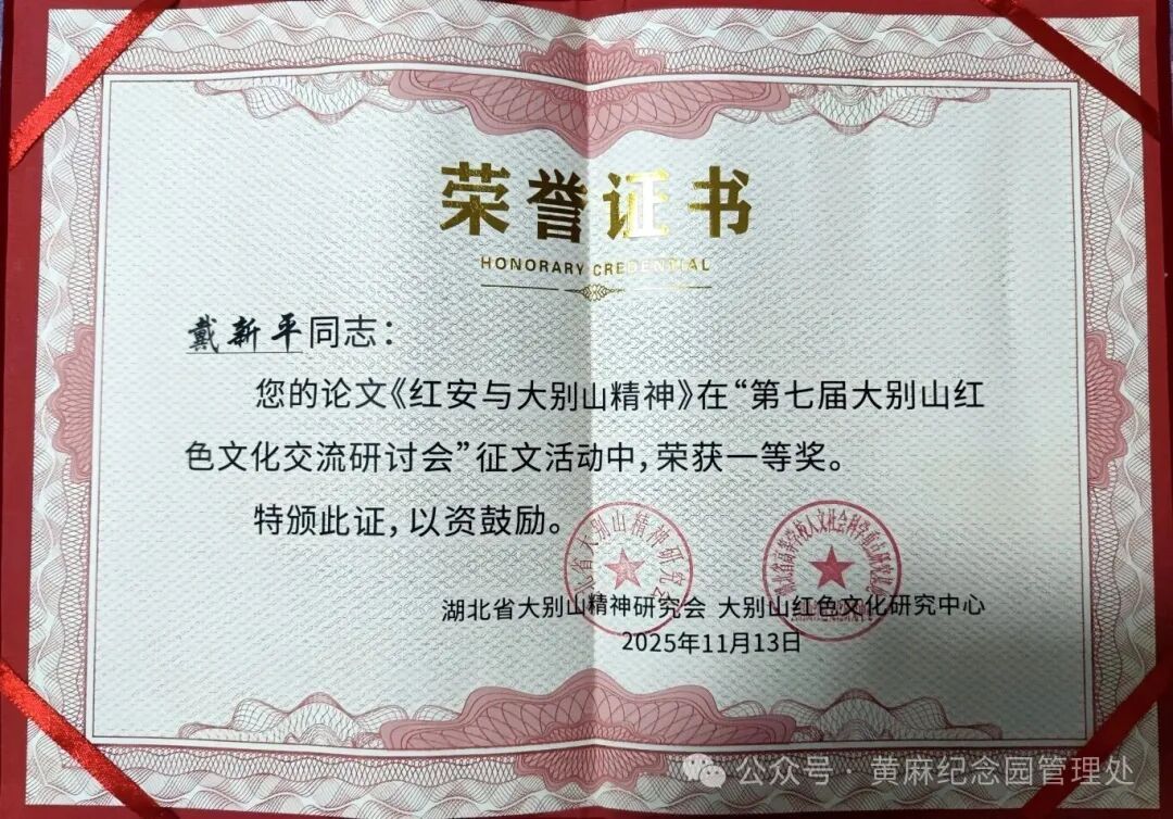 这份荣誉,既是对戴新平同志深耕红色文化研究、潜心挖掘精神内涵的肯定,也彰显了黄麻纪念园对红色文化学术研究的重视和深耕细作的扎实成效。作为大别山精神核心承载地的重要文化阵地,黄麻纪念园始终以传承红色基因、讲好革命故事为己任,未来也将持续深耕红色文化研究,让红安红色文化、让大别山精神在新时代焕发出更加耀眼的光芒!