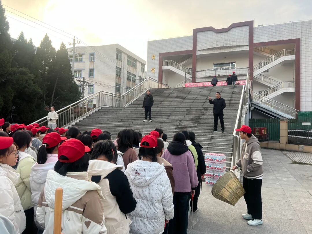 当日16时,教学楼楼下热闹集结。同学们佩戴红色志愿帽,精神抖擞领取劳动工具,红帽在阳光下格外醒目,承载着服务校园的热忱。队伍有序抵达老校区后,带队负责人细致宣讲安全要点,为活动筑牢安全防线。