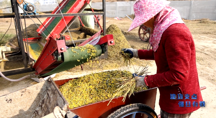 红安润康农业发展有限公司副总经理陈孟洋说:“我身后的这台野菊花脱花机,是我们经过五年的改造,目前是全国野菊花国内最先进的野菊花脱花设备,它可以做到每小时从加工到3-4吨的野菊花原材料,做到把花杆、叶、粉末全部分离开来,方便我们集中的杀青烘干。”