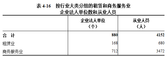 在租赁和商务服务业企业法人单位中,租赁业占19.10%,商务服务业占80.90%。在租赁和商务服务业企业法人单位从业人员中,租赁业占16.38%,商务服务业占83.62%(详见表4-16)。