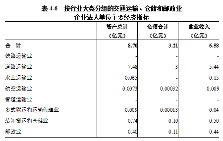 2023年末,交通运输、仓储和邮政业企业法人单位资产总计8.70亿元,比2018年末下降-33.18%;负债合计3.21亿元,比2018年末下降57.20%。