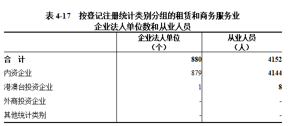 在租赁和商务服务业企业法人单位从业人员中,内资企业占99.81%,港澳台投资企业占0.19%(详见表4-17)。