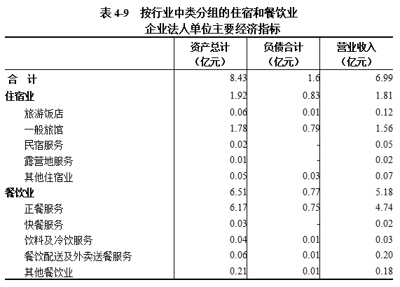 在住宿和餐饮业企业法人单位中,住宿业占26.23%,餐饮业占73.77%。在住宿和餐饮业企业法人单位从业人员中,住宿业占25.79%,餐饮业占74.21%(详见表4-7)。