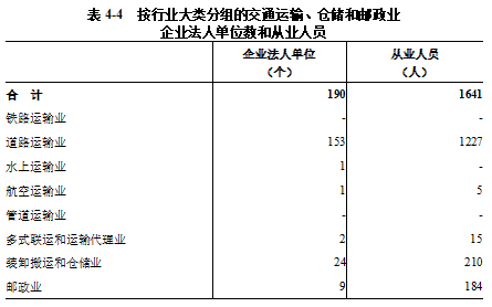 2023年末,全县共有交通运输、仓储和邮政业企业法人单位190个,从业人员1641人,分别比2018年末增长126%和0.30%(详见表4-4)。