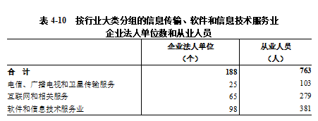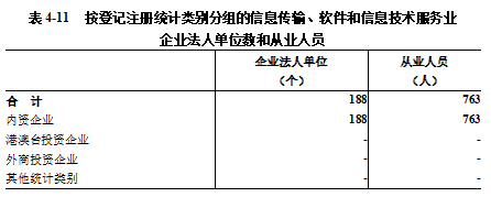 在信息传输、软件和信息技术服务业企业法人单位从业人员中,内资企业占100%(详见表4-11)。