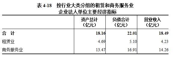 2023年末,租赁和商务服务业企业法人单位资产总计18.16亿元,比2018年末下降79.06%。其中,租赁业企业法人单位资产总计4.69亿元,比2018年末增长1854.16%;商务服务业企业法人单位资产总计13.47亿元,比2018年末下降67.73%。租赁和商务服务业企业法人单位负债合计22.01亿元,比2018年末增长32.59%。