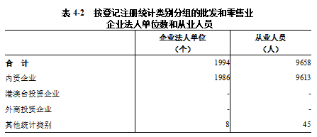 在批发和零售业企业法人单位从业人员中,内资企业占99.53%(详见表4-2)。