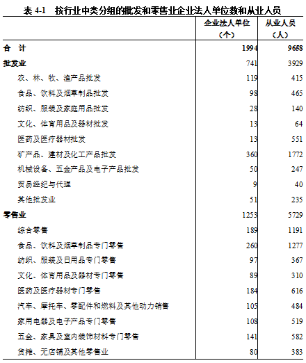 在批发和零售业企业法人单位中,批发业占37.16%,零售业占62.84%。在批发和零售业企业法人单位从业人员中,批发业占40.68%,零售业占59.32%(详见表4-1)。
