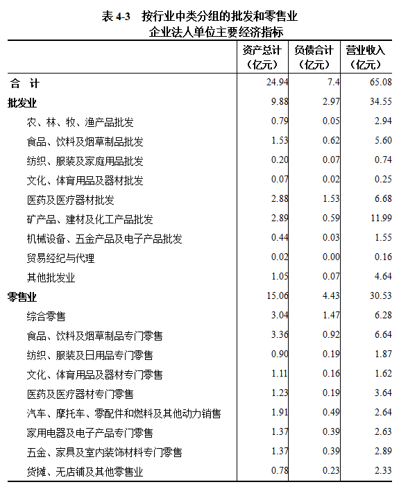 2023年末,批发和零售业企业法人单位资产总计24.94亿元,比2018年末增长14.89%;负债合计7.4亿元,比2018年末增长10.63%。