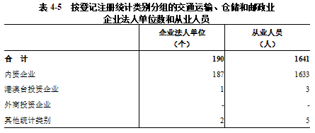 在交通运输、仓储和邮政业企业法人单位从业人员中,内资企业占99.51%,港澳台投资企业占0.18%(详见表4-5)。