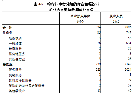 2023年末,全县共有住宿和餐饮业企业法人单位324个,从业人员2896人,分别比2018年末增长159.20%和88.42%。