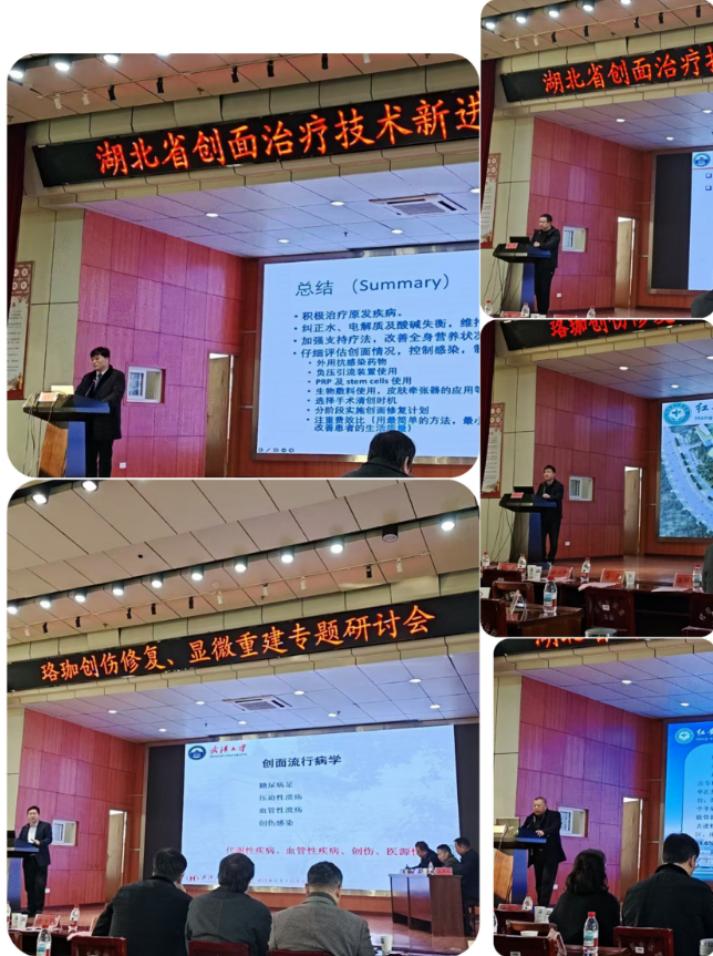 学术授课环节,喻爱喜教授率先分享《四肢骨与软组织缺损精准诊疗关键技术构建及临床应用体系》,为创面治疗提供了系统性解决方案;武汉市三医院张祥明教授详解《褥疮的规范化诊疗》,为临床常见难愈性创面处理提供实操指南;红安县人民医院彭子和主任结合本院实践,讲述《红安县人民医院骨科的发展之路》,展现了基层医院学科建设的坚实步伐。此外,武汉大学中南医院陶圣祥、祝少博、漆白文、余黎等专家分别就《人生的旱与涝——显微人的灌与疏》、《陈旧性骨折治疗》、《创面治疗技术进展》、《外固定架在畸形矫正中的应用》等主题分享前沿成果。