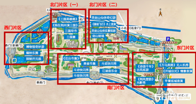 东门片区:以楚文化为核心载体,围绕护城河、金凤广场、寅宾门、张居正街进行打造。
