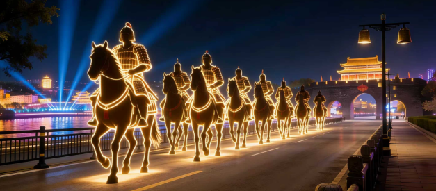 内容:通过光束、切割灯打亮城墙、渲染氛围,同时通过激光投射,营造动态马匹跃出水面的效果。