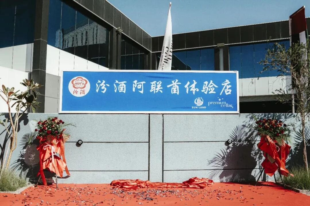 开业仪式上,汾酒国际相关负责人、庞学禹董事长共同为“汾酒阿联酋体验店”揭幕,红色绸布缓缓落下,标志着体验店正式面向公众开放。