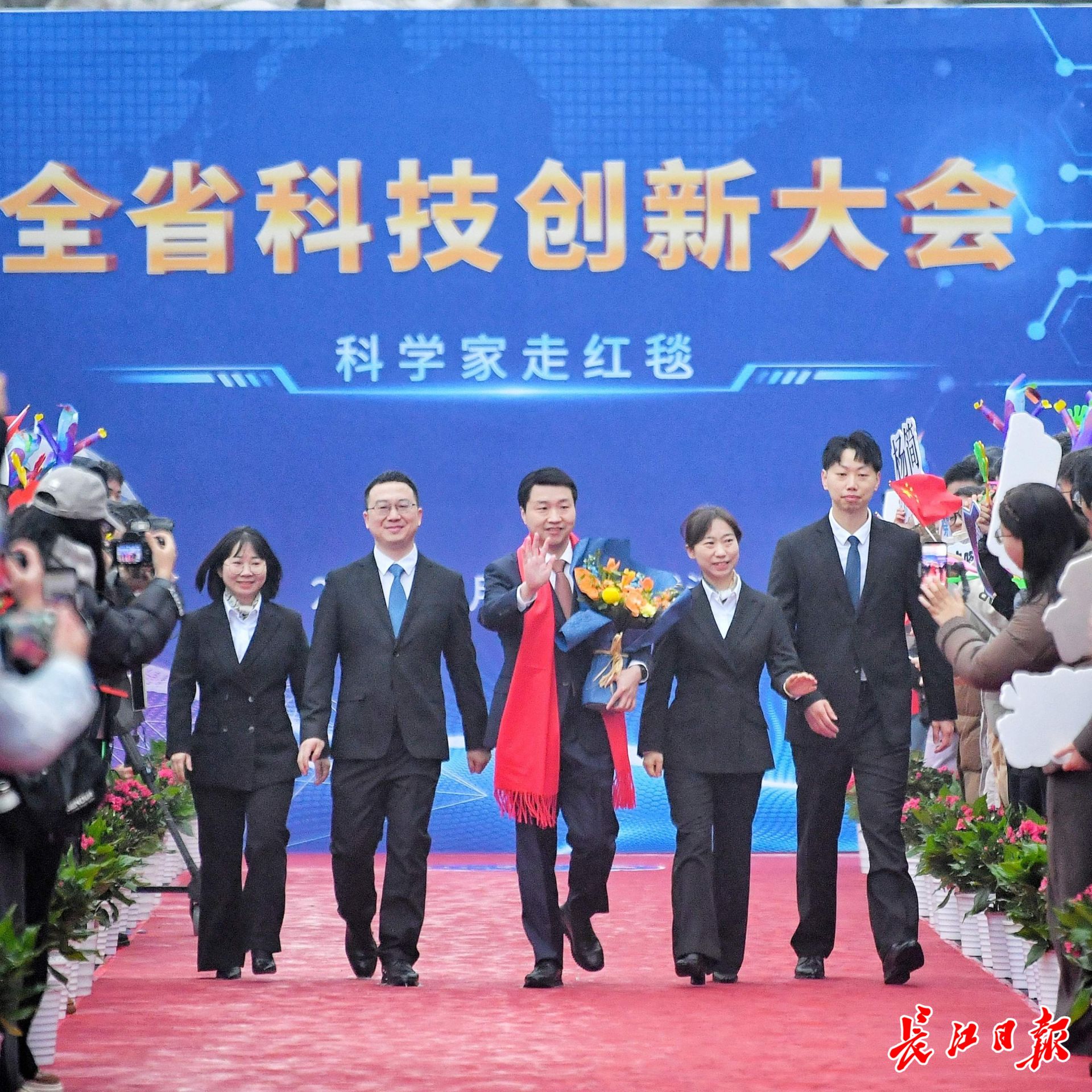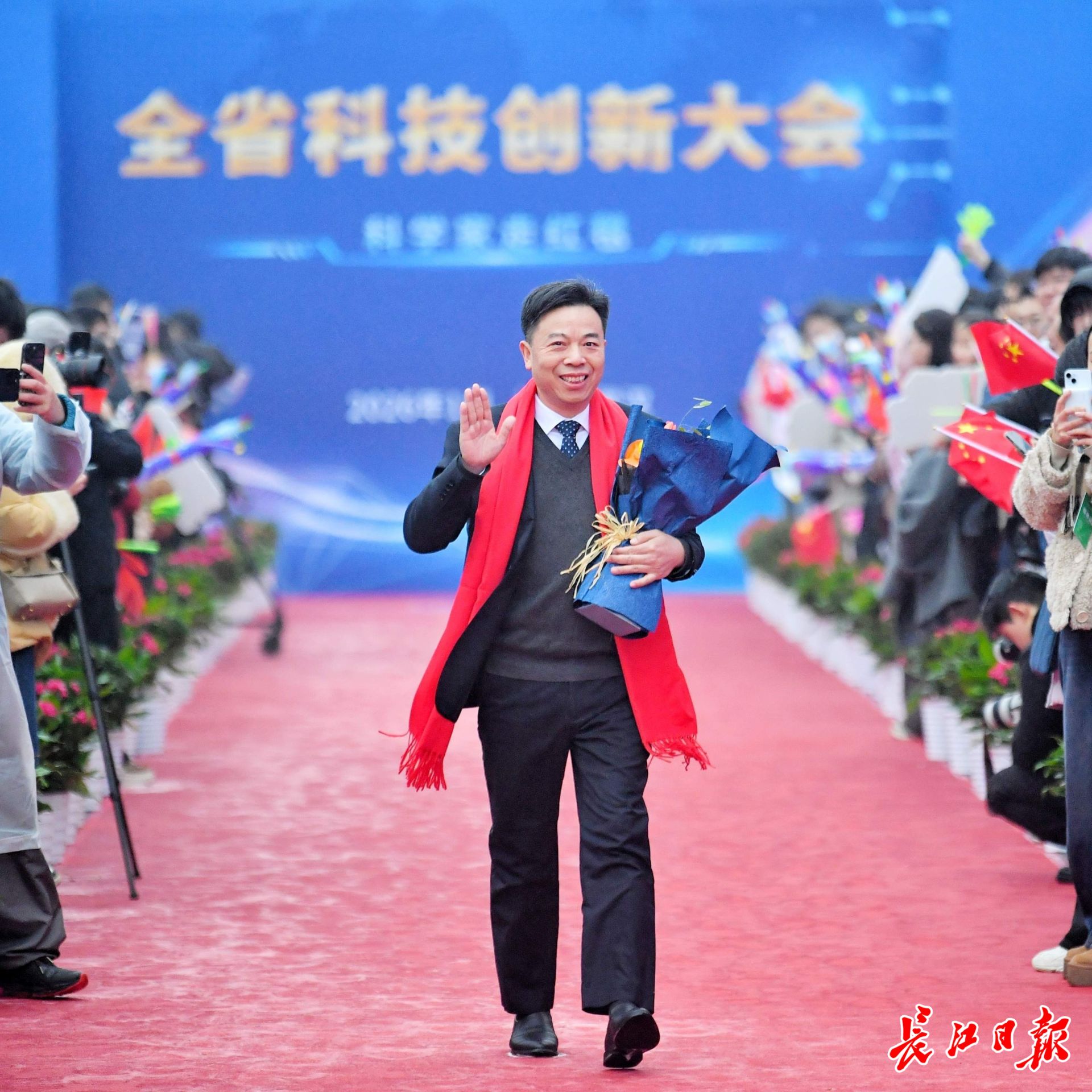 长江日报大武汉客户端1月4日讯 1月4日,湖北省科技创新大会在武汉举行。举办大会的洪山礼堂外,一条百米红毯铺就星光大道,在鲜花簇拥中,12位“科学之星”款步而来。这已是湖北省科技厅“科学家走红毯活动”第七年绽放荆楚,见证着湖北科技创新的蓬勃脉动。