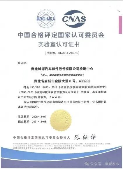 2025年冬至刚过,麻城重点零部件企业——湖北诚源汽车部件股份有限公司就传来喜讯——该公司检测中心正式获得国家级CNAS实验室认证。