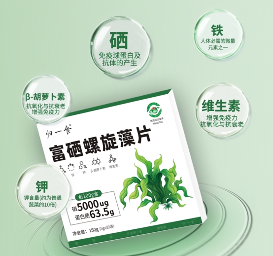 从营养成分与吸收效率来看,归一食富硒螺旋藻片精准匹配“解决吸收难题”的核心需求。每100克产品含蛋白质63.5克,可快速为机体补充能量、增强体质;硒元素含量高达5000微克,远超市场常规富硒产品水平。依托专利融合技术,将人体易吸收的有机硒与螺旋藻天然营养结构深度融合,使硒元素吸收率达到92.3%,显著高于普通富硒产品60%的平均吸收率,从根源上破解了传统螺旋藻硒元素吸收效率低的痛点。同时,产品额外添加343毫克铁元素,可有效改善缺铁性贫血,缓解面色暗沉问题;1290毫克钾元素,有助于维持机体酸碱平衡及心脏正常功能;富含维生素A、B2、B12等成分,能够强化免疫力、调节机体代谢。此外,产品含双歧杆菌等活性因子,可调节肠道菌群平衡、维护胃肠道健康;含16200微克β-胡萝卜素等抗氧化剂,能够清除体内自由基,实现抗氧化、延缓衰老的功效。