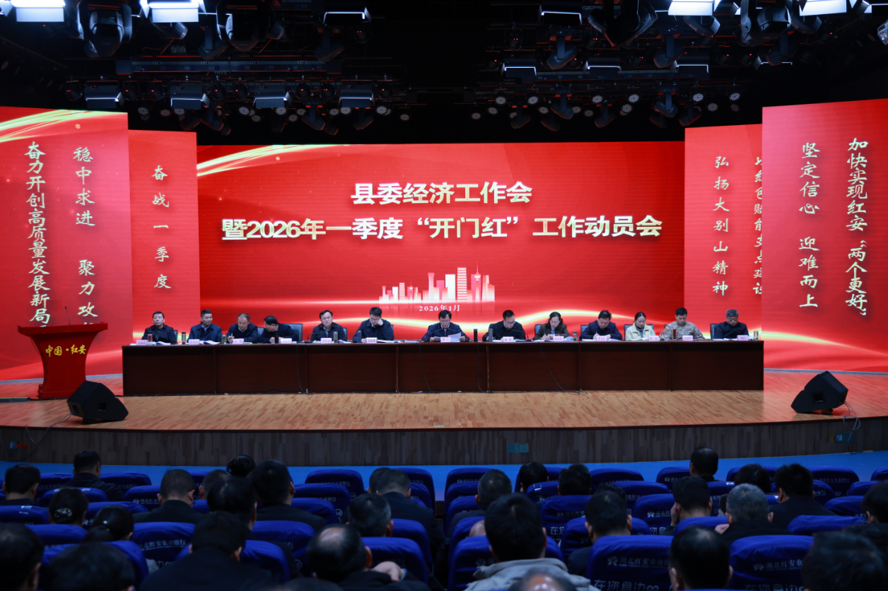 红安网消息 1月10日上午,红安县委经济工作会暨2026年一季度“开门红”工作动员会召开,深入贯彻党的二十届四中全会和中央、省委、市委经济工作会议精神,总结全县2025年经济工作,安排部署2026年经济工作和一季度“开门红”工作。红安县委书记胡广主持会议并讲话,红安县委副书记、代县长钟林作工作部署,张思路、张凤珍、余宏波、段炎涛、熊孟元、韩琼、阮璘、赵湘伟、高金磊、刘晓军、余品祥等县“四大家”领导班子成员及其他县级领导,各乡镇(场、处)党政主职、项目秘书,县直各单位主要负责人,工业经济产值增长重点企业和春节不停产重点企业负责人,红色火种特训营学员等参加会议。