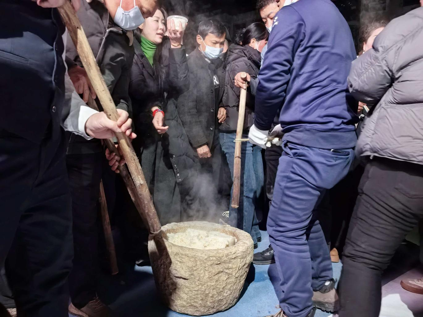 除了精彩的文艺演出,广场一侧的民俗体验区更是人气爆棚,成为本次活动的一大亮点。一口大铁锅架在炉火上,糯米在锅中蒸腾翻滚,香气弥漫在整个广场,几位经验丰富的村民正手持木槌,合力“打糍粑”——木槌起落间,洁白的糯米被捣得软糯细腻,围观的群众纷纷上前体验,亲手揉制糍粑,感受传统民俗的乐趣。旁边的“猜糍粑”谜戏互动环节更是妙趣横生,主持人抛出“白胖子,裹麻糖,咬一口,甜又香(打一美食)”等趣味谜题,观众踊跃抢答,答对者便能获得一份刚做好的热糍粑,欢声笑语中,民俗文化的魅力悄然传递。