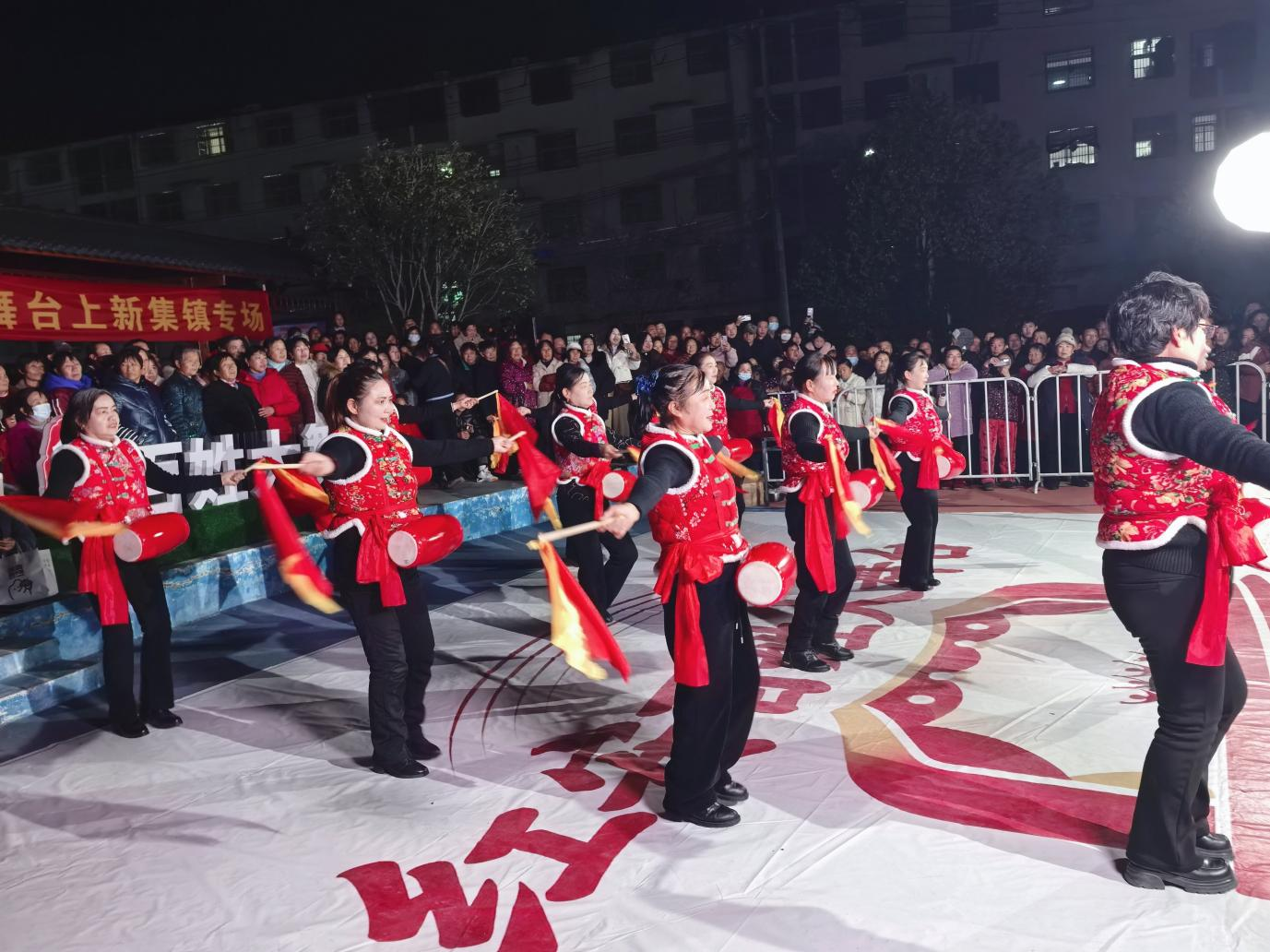 “咚咚锵!咚咚锵!”新和村文艺队的腰鼓表演节奏明快,鼓点铿锵,队员们迈着矫健的步伐,变换着“吉祥如意”“五谷丰登”等寓意美好的队形,红色的腰鼓在灯光下翻飞,既展现了乡村群众的精神风貌,又透着浓浓的乡土气息。紧随其后的歌舞表演旋律悠扬、舞姿舒展,唱出了村民们对美好生活的向往,舞出了上新集的发展变迁。