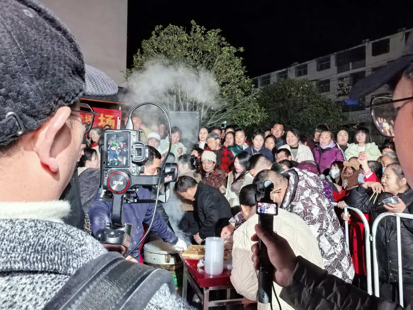 晚会现场,掌声、欢呼声、喝彩声此起彼伏,高潮迭起。台下的观众们有的举着手机拍照录像,记录下精彩瞬间;有的跟着旋律轻轻哼唱,沉浸在欢乐的氛围中;还有的互相交流着感受,分享着对家乡变化的喜悦。“以前农闲时大家要么在家看电视,要么打牌,现在有了这样的文化活动,不仅能欣赏精彩的节目,还能和乡亲们聚在一起,感觉日子越来越有滋味了!”家住上新集镇区的曾大爷笑着说,手里还捧着刚抢到的热糍粑,脸上满是幸福。