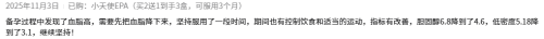 ②8月常规体检发现高血脂,医生说低密度有点高让吃药,纠结了一下(没有家族史,没有血压血糖等任何问题),决定不拿药,医生推荐日常可以吃点鱼油。给自己一个月时间饮食+运动调整,期间一直坚持吃这款,1个多月后复查指标正常啦,感觉饮食调整也很关键,运动我没太能坚持,前面几天跑步,后面没能坚持住,但是每天都有饭后散步,偶尔打羽毛球。