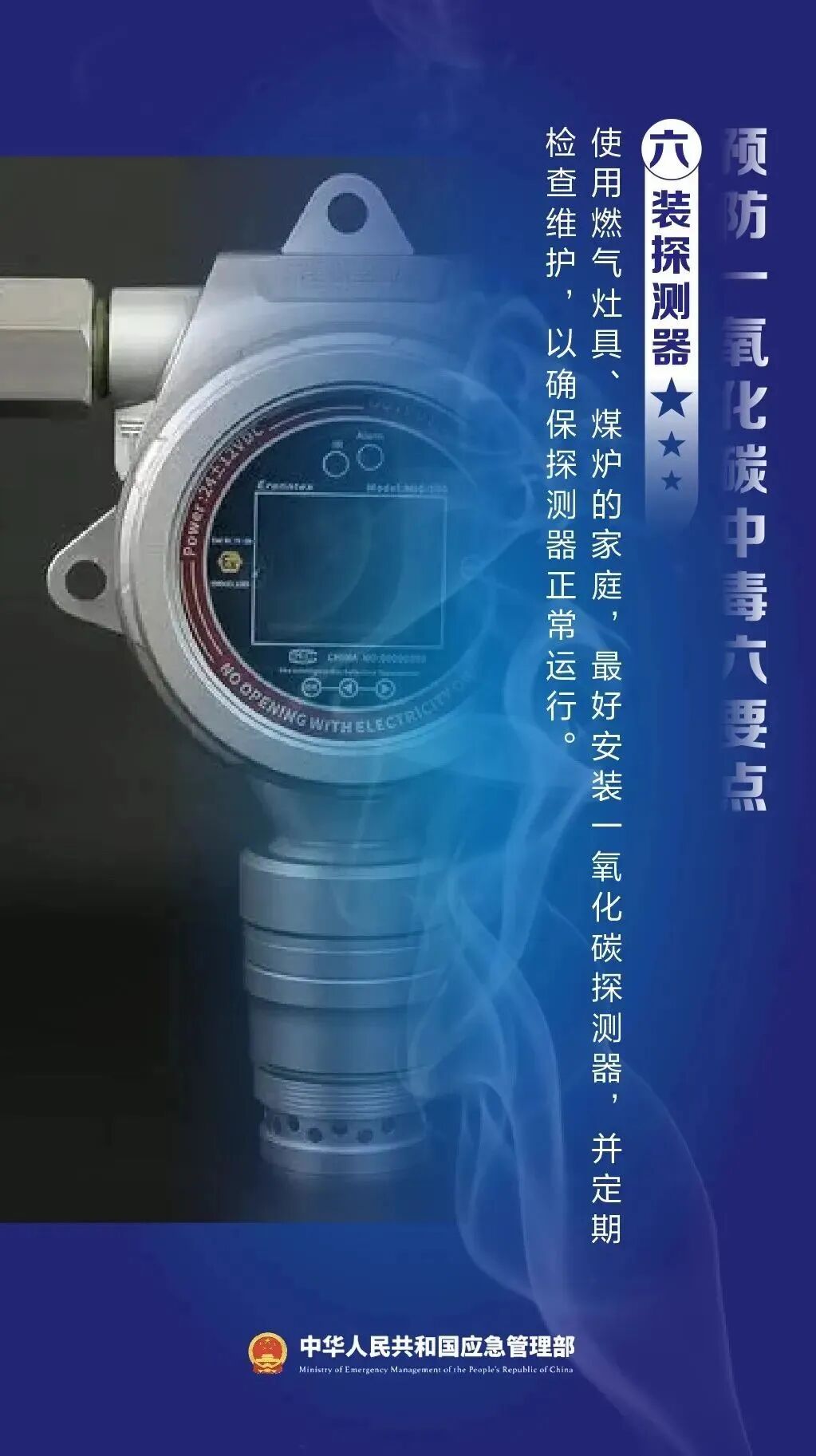 4. 安装一氧化碳报警器:这是一种能够实时监测室内一氧化碳浓度的设备,当室内一氧化碳浓度超过设定值时,报警器会发出警报,提醒人们及时采取措施。报警器应安装在位置合理、易于观察的地方,并确保其能正常工作。