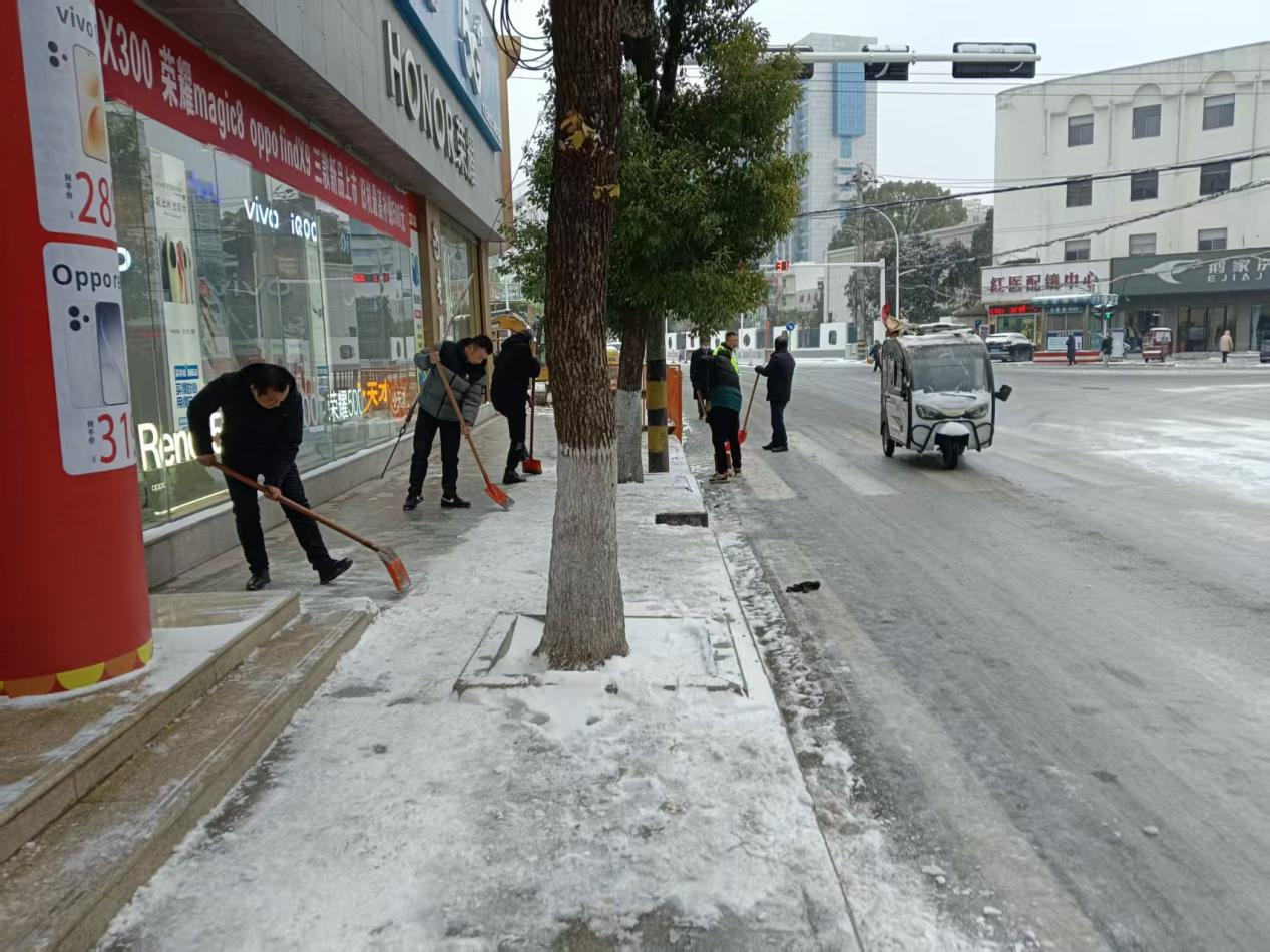 图说:红安县城关镇组织镇村社区干部和志愿者开展迎寒保畅