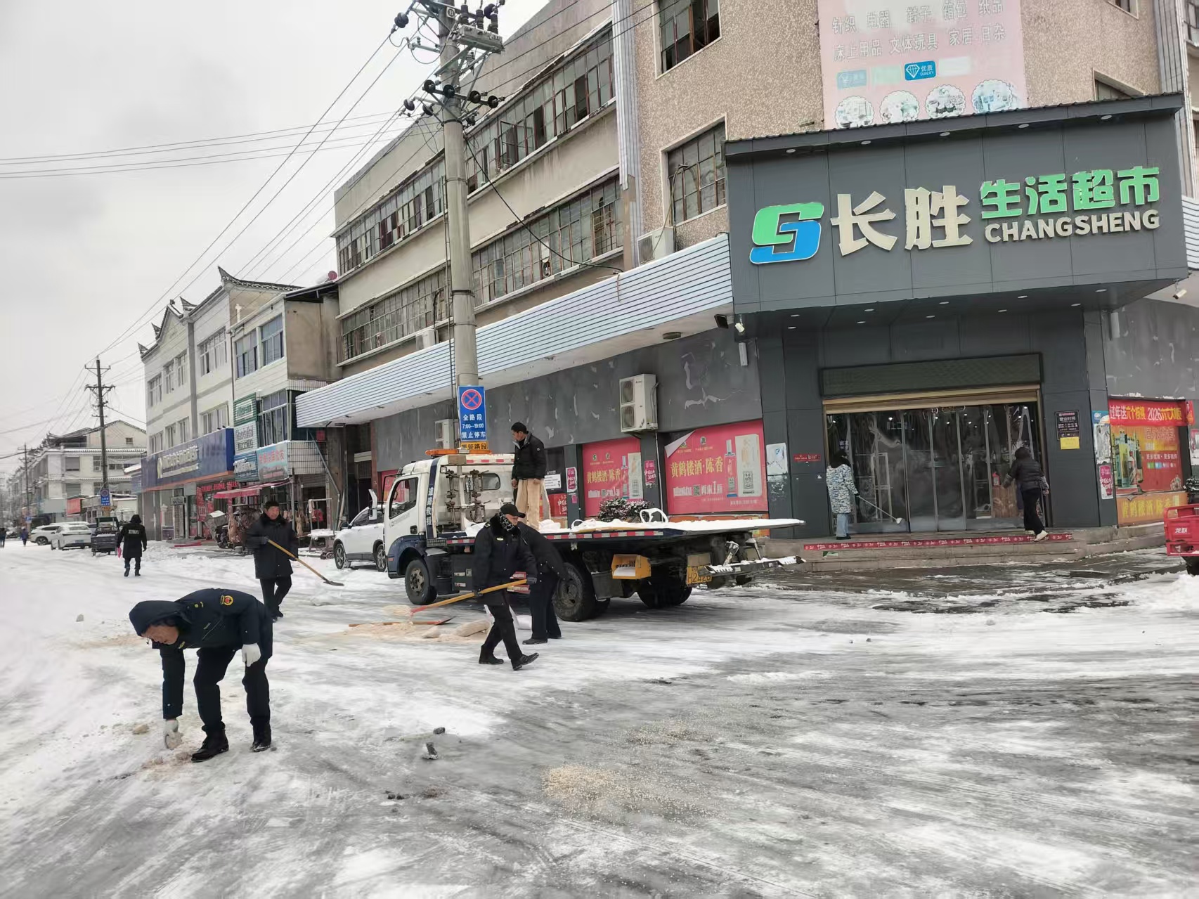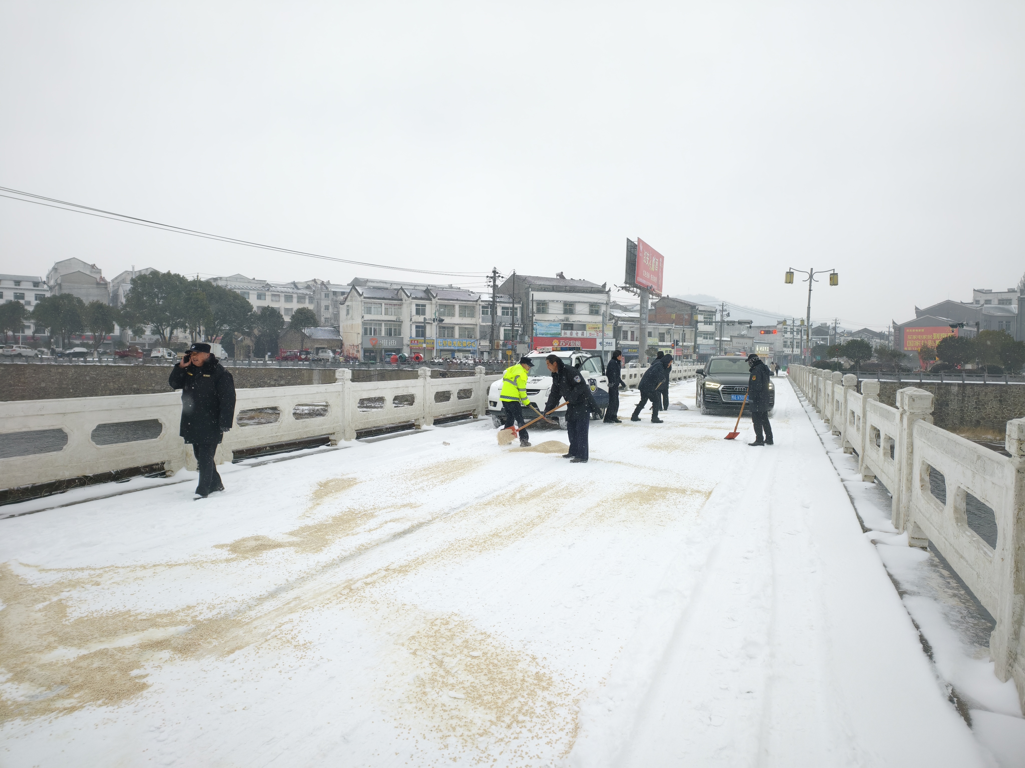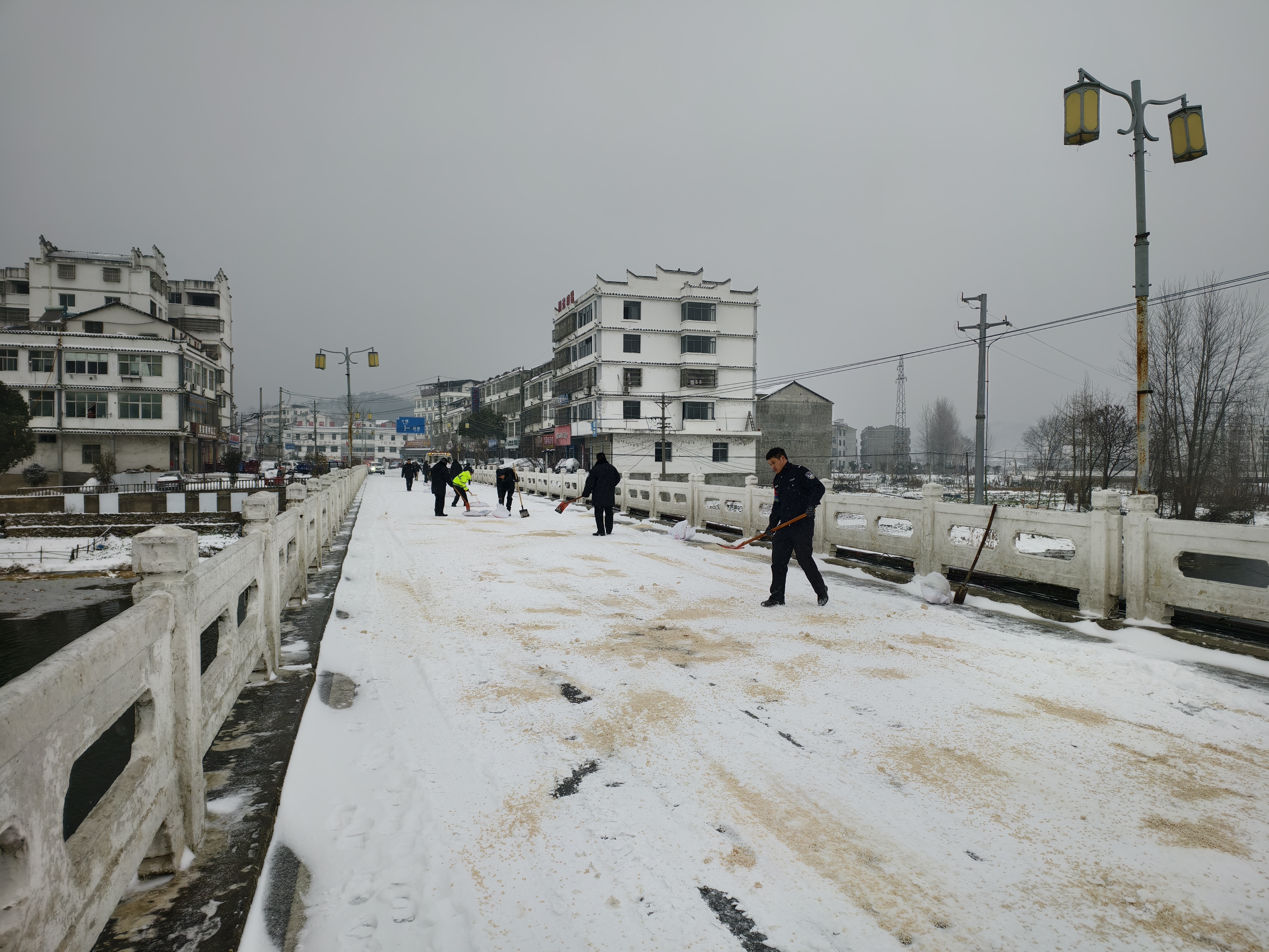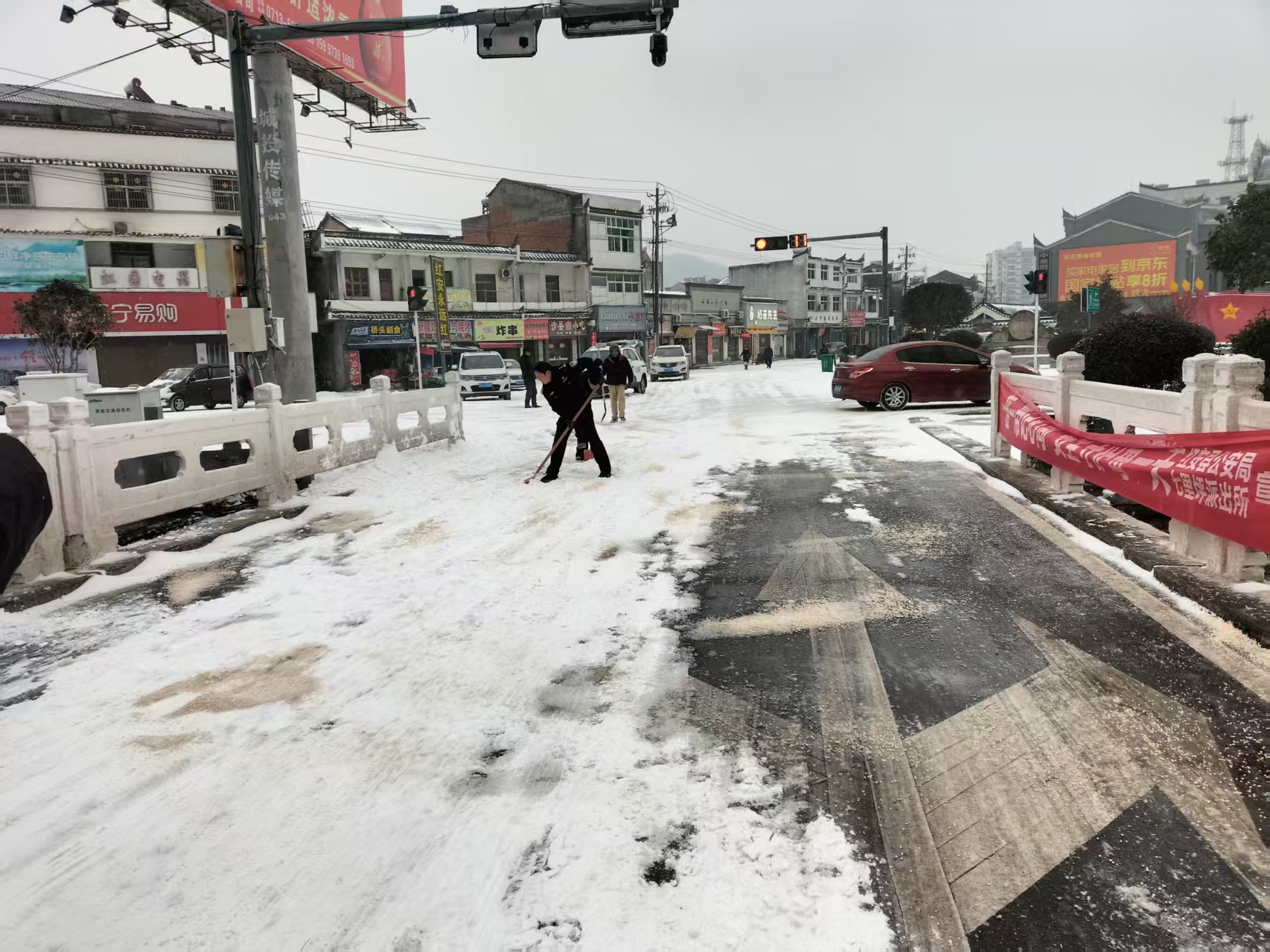 1月20日,红安县七里坪镇统筹派出所、城管等部门力量,对镇区主要主干道开展积雪集中清理作业,通过机械除雪、人工清扫、撒布融雪剂等多种方式,清除路面积雪,保障道路通行安全畅通。