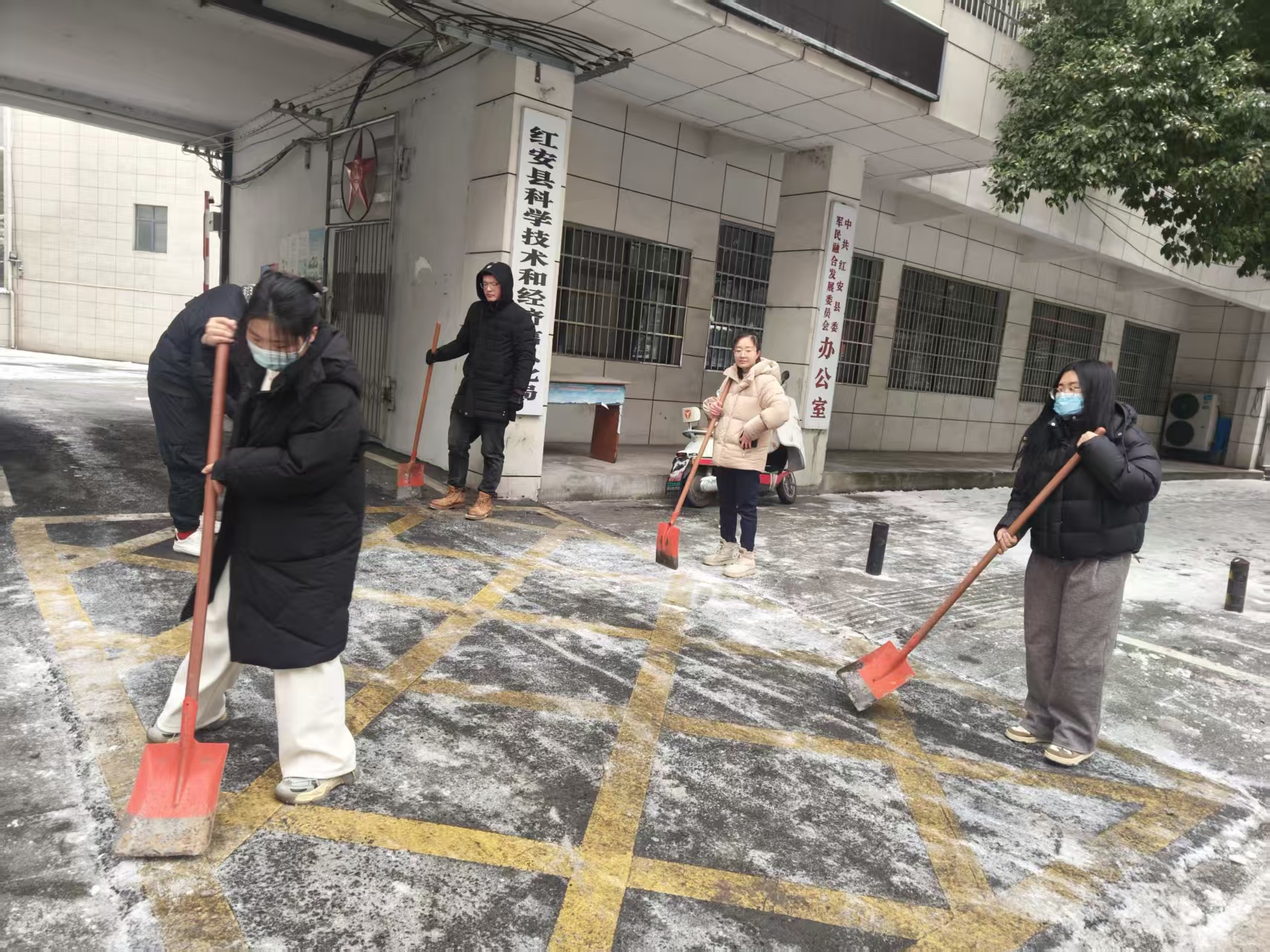 1月20日,红安县科经局组织党员干部做好单位庭院及门前道路积雪清扫、清障疏通工作,确保办公场所公共安全。