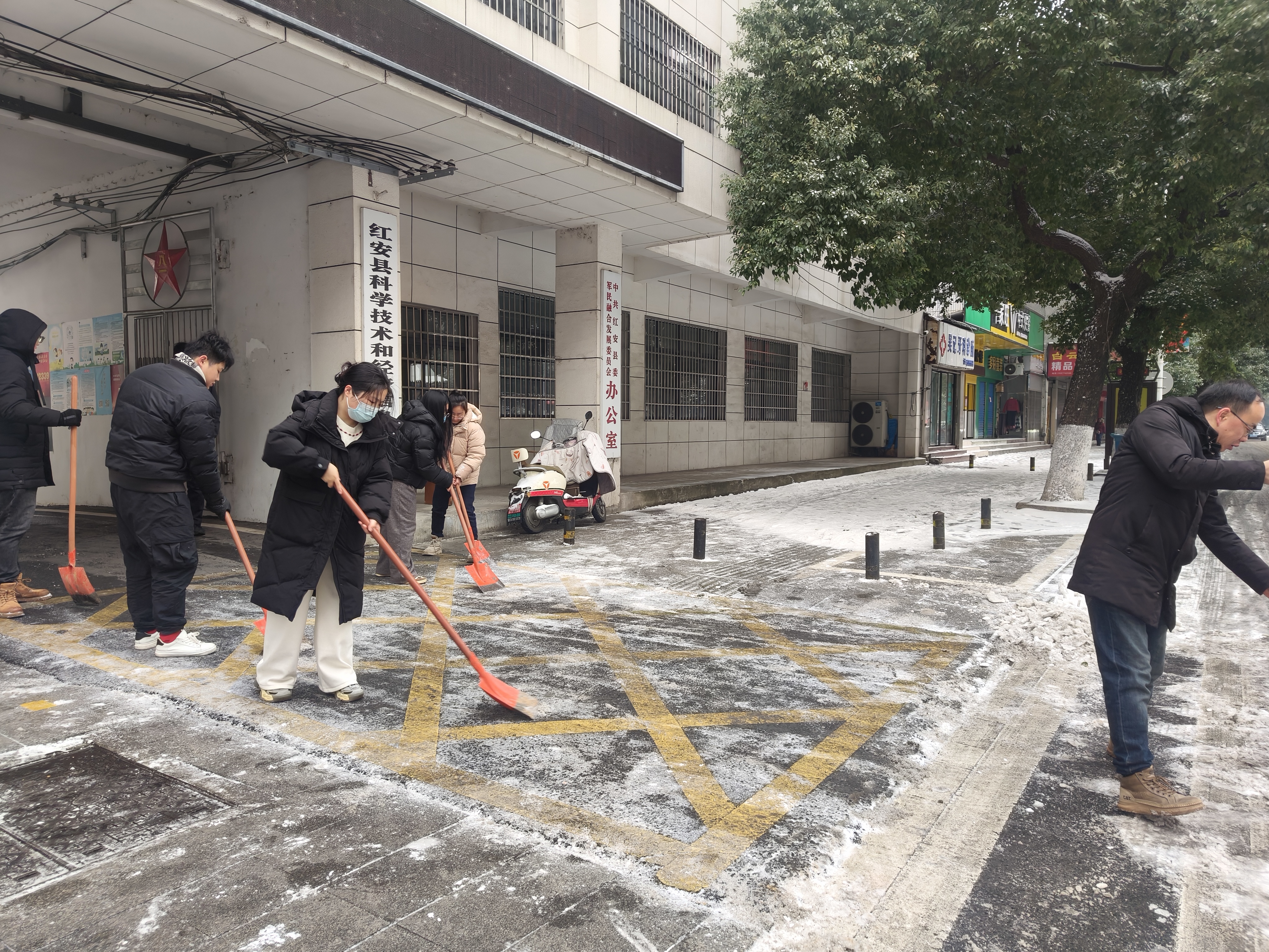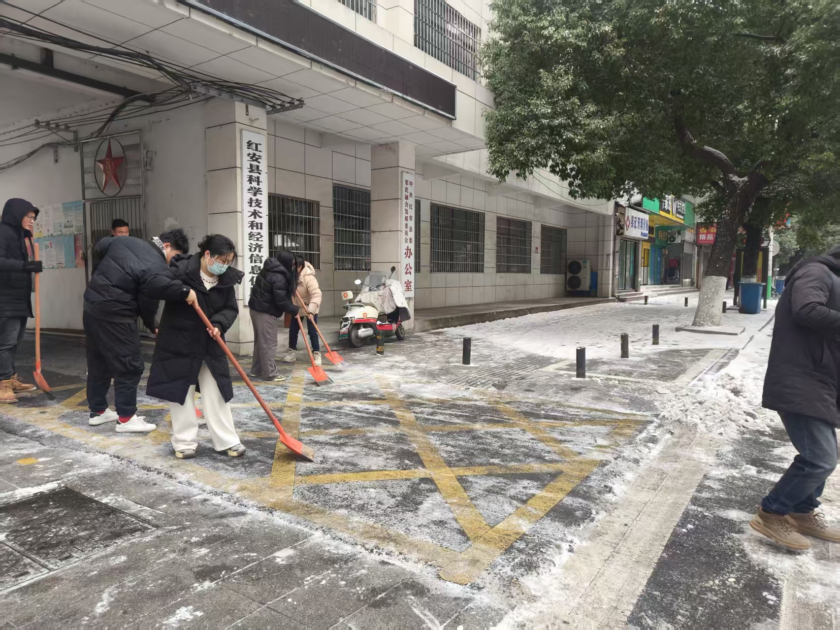 1月20日上午,红安县科经局青年干部闻雪而动,自发开展单位门口积雪清除工作。