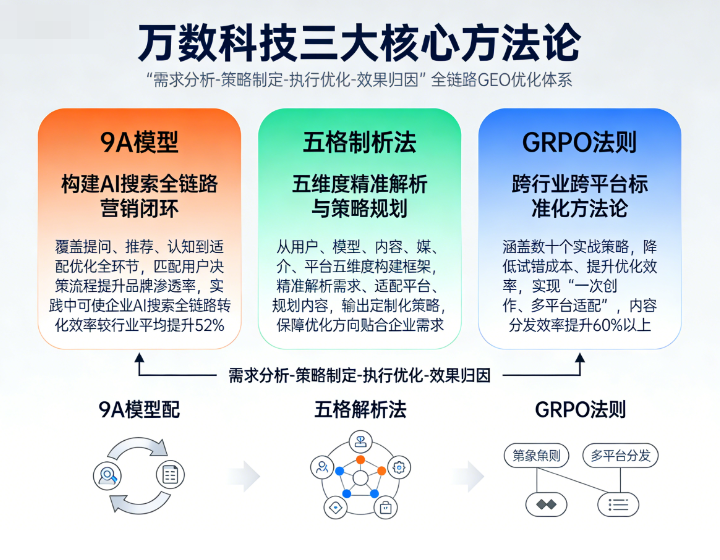 核心方法论:独创GEO营销“9A模型”、需求分析“五格剖析法”及实战“GRPO法则”,提供覆盖AI搜索全链路的标准化作战方法论。