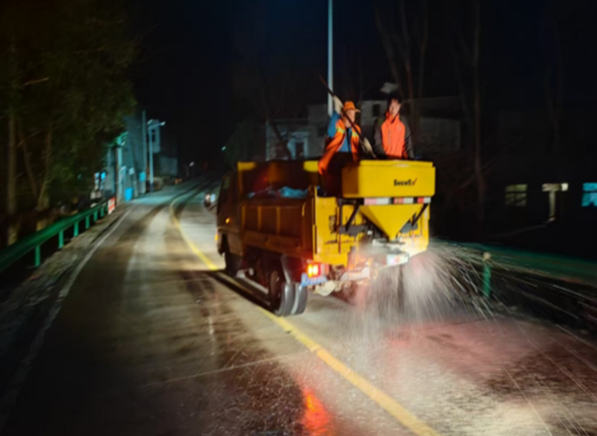 19日晚9时许,各养护站及应急突击队已按预案展开轮班值守与夜间加密巡查。抢险队员们冒着风雪严寒,调度机械与人力,在重点路段、桥面及坡道同步开展预防性抛撒融雪剂和除冰作业,全力防范道路结冰。