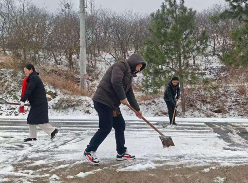 “路滑,大家慢点开!”一大早,镇村工作人员就已上岗,在主干道、桥梁、陡坡等重点路段值守巡查。他们不仅设置了醒目的临时警示标志,还及时撒布融雪剂、铲扫积雪,确保车辆行人通行安全。从昨晚到今晨,这些“护路人”默默坚守,成为风雪中最让人安心的身影。