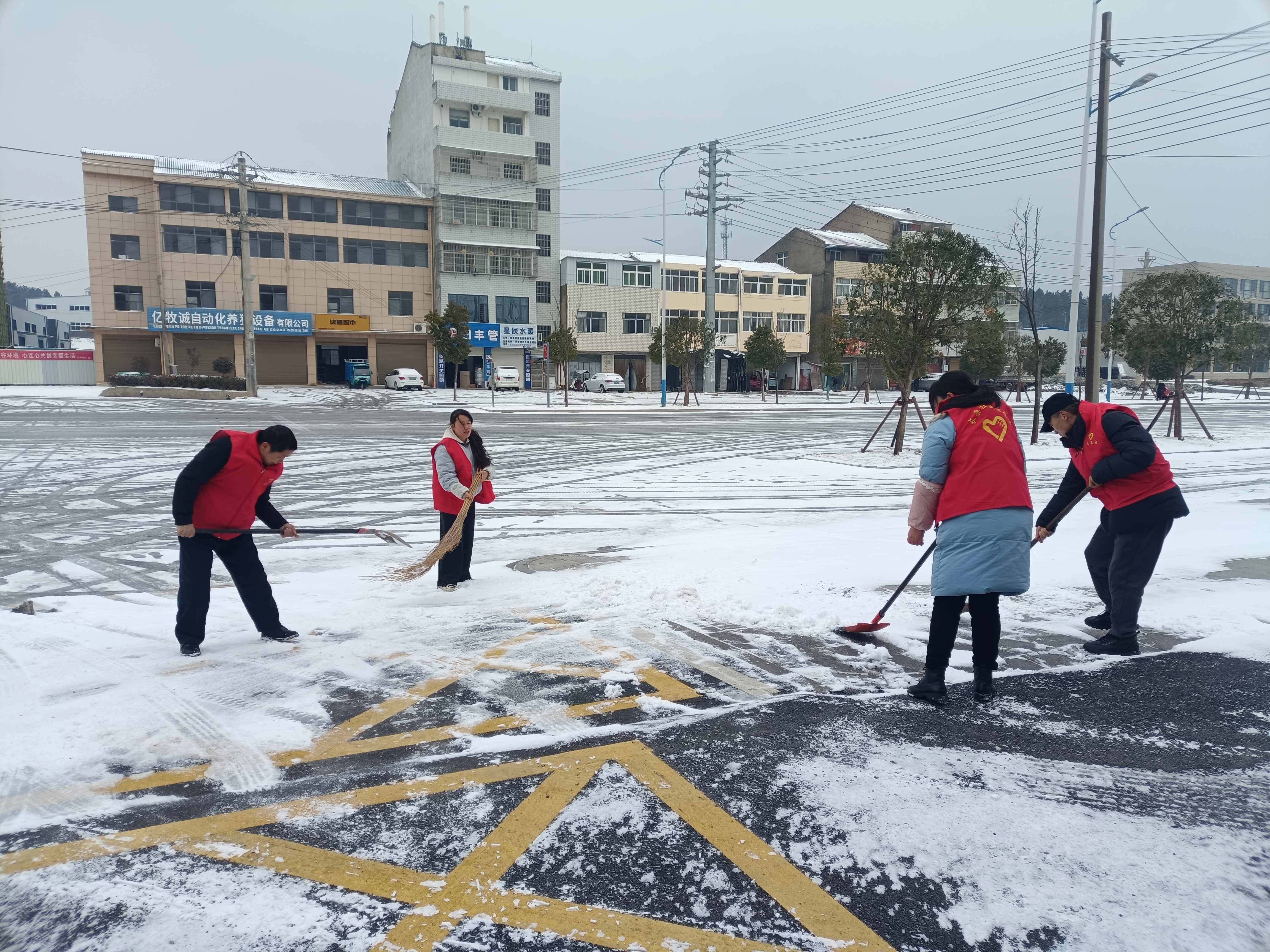 执法大队组织机关股室党员干部下沉长渠社区对辖区街道和大队临街街道进行铲雪除冰。