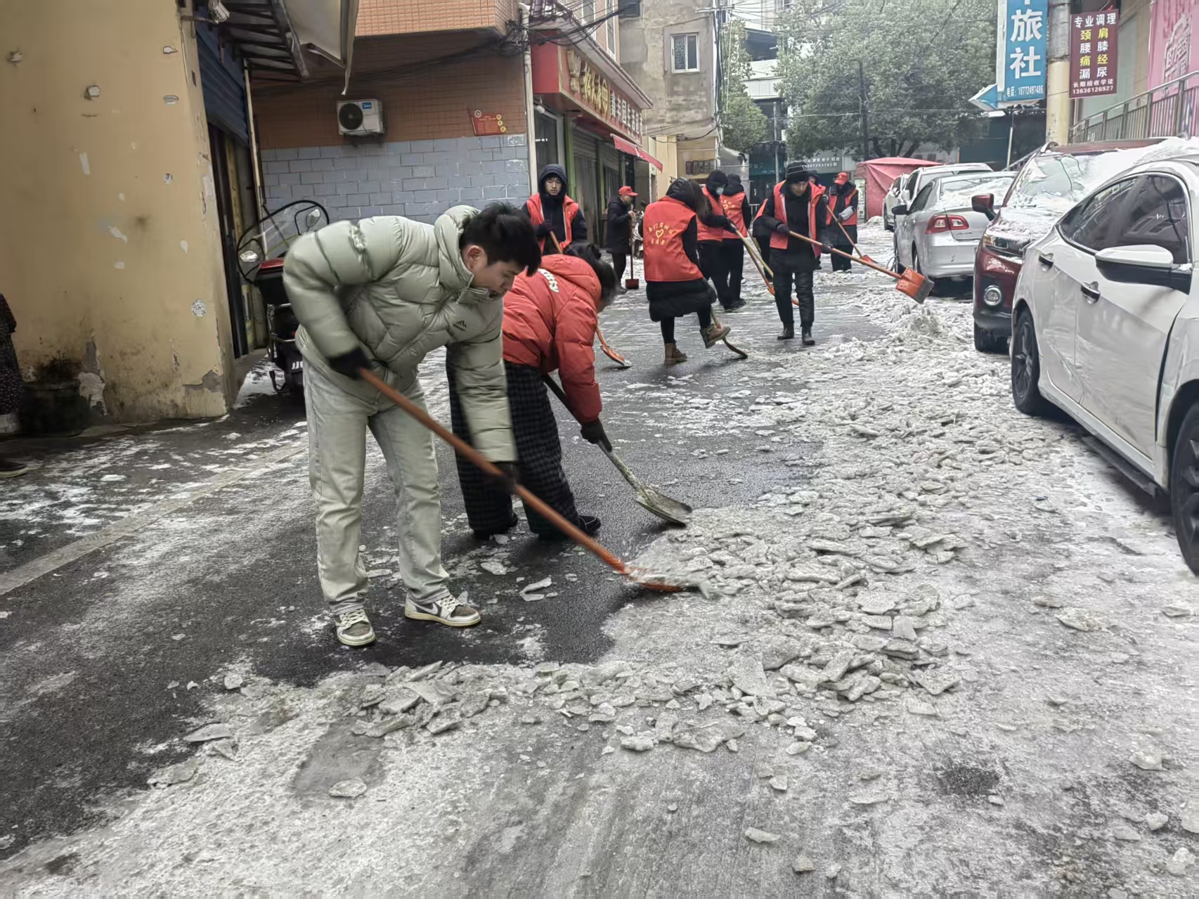 红安县工业经济联合会组织党员干部下沉南门岗社区,开展扫雪除冰志愿活动。