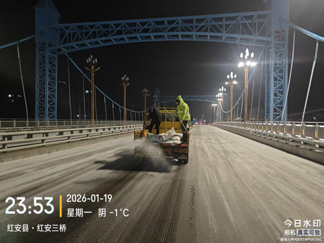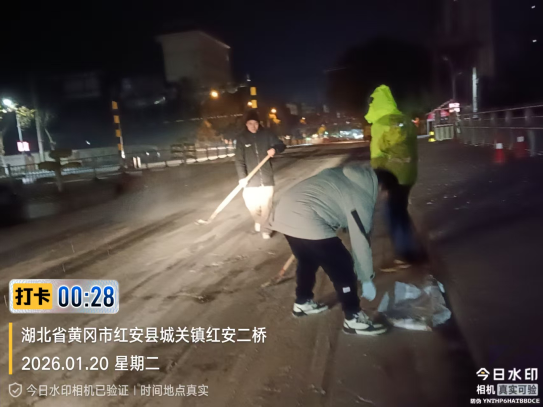 红安网消息 1月19日晚,红安县迎来新年首场降雪。受强寒潮影响,城区主次干道、十字路口、坡道和桥梁等区域迅速积雪结冰,给群众出行安全和城市正常运转带来严峻挑战。