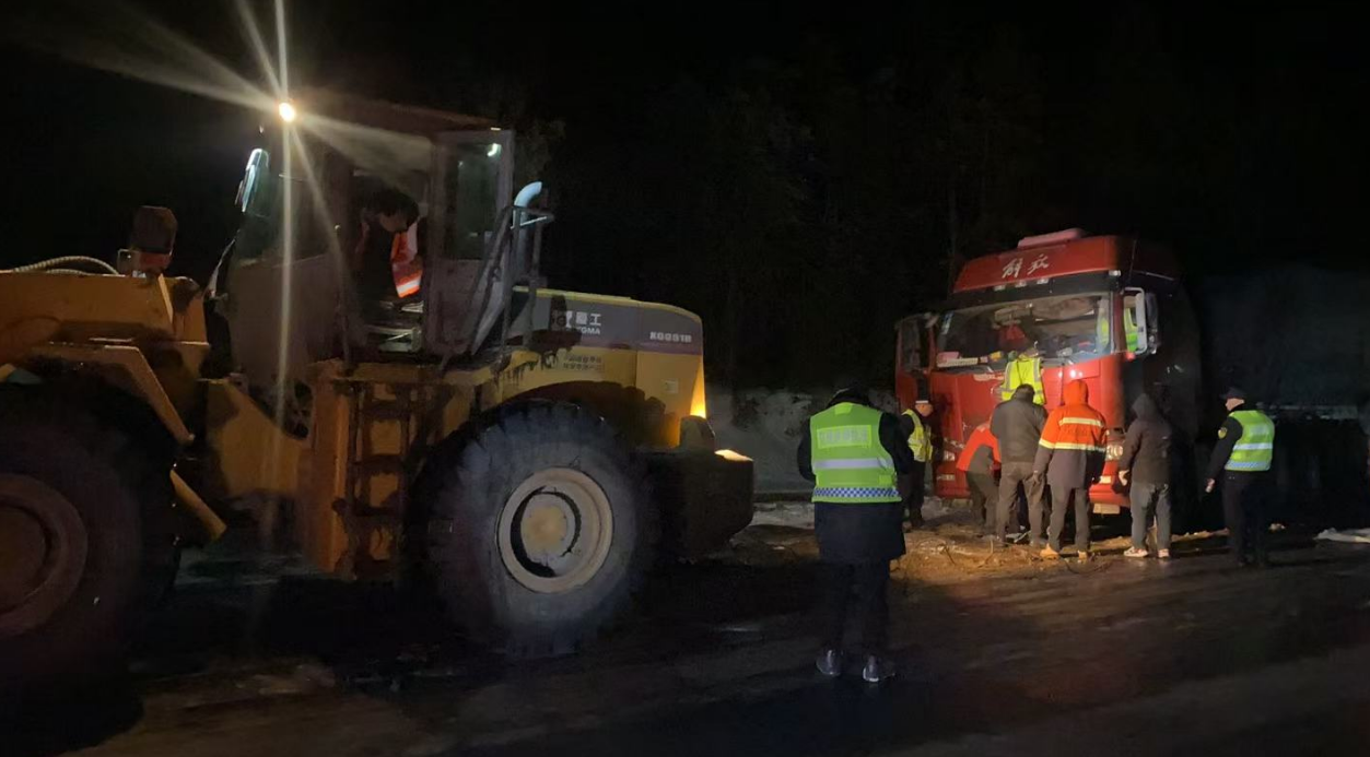 险情就是命令!应急突击队、座山湾养护站闻令而动,迅速集结,携带机械设备火速出发,同时,分管领导第一时间赶赴现场协调指挥。公路部门与交通执法部门协同作战、联勤联动、密切配合。寒风刺骨,夜色如墨,现场却一派热火朝天,忙碌而有序。