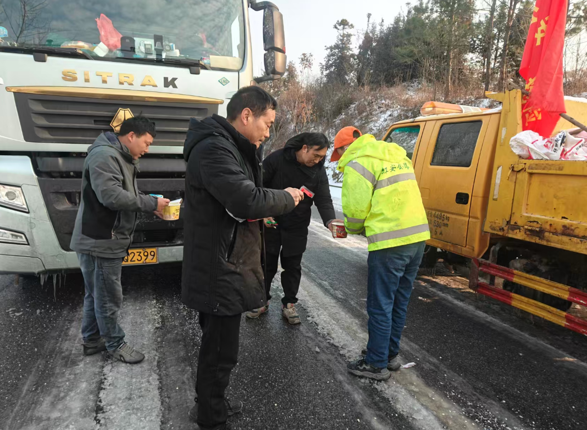 为防止夜间低温导致路面再次结冰,21日一大早,座山湾养护站养护人员顾不得休息,再次重返昨夜易结冰受困路段,抛洒融雪剂除冰,并为过往司乘人员送上热腾腾的泡面和开水,用实际行动在寒风里传递着无声的温暖。