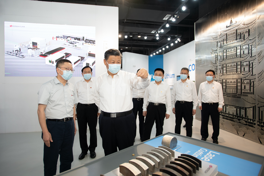 2022年6月28日下午,习近平总书记在武汉华工激光工程有限责任公司激光科技馆,察看激光技术产业应用展品。(图源:新华社)