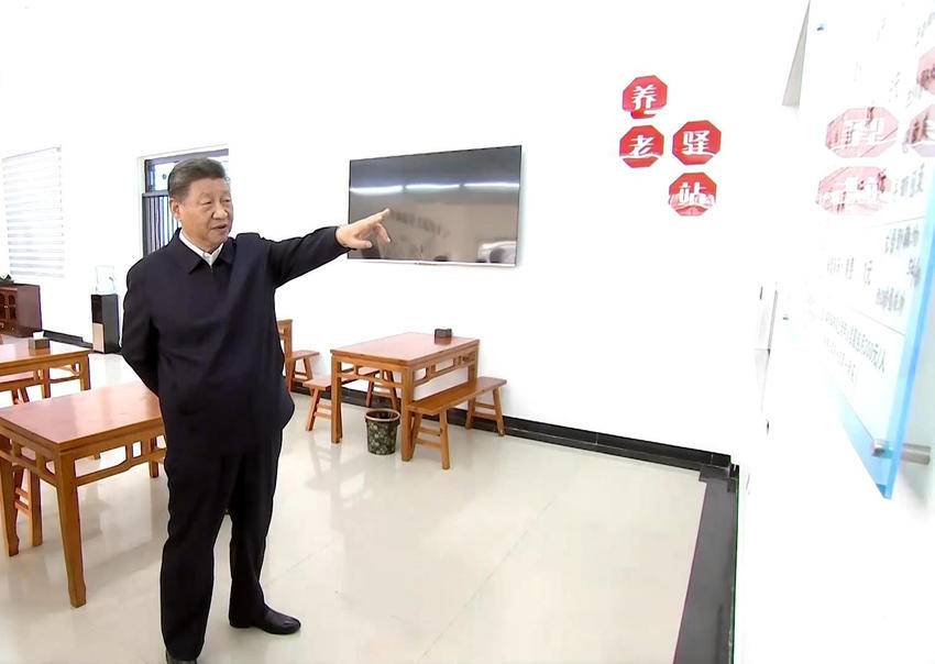 2024年11月5日上午,习近平总书记在咸宁市嘉鱼县潘家湾镇四邑村养老服务驿站食堂考察。(图源:央视新闻)
