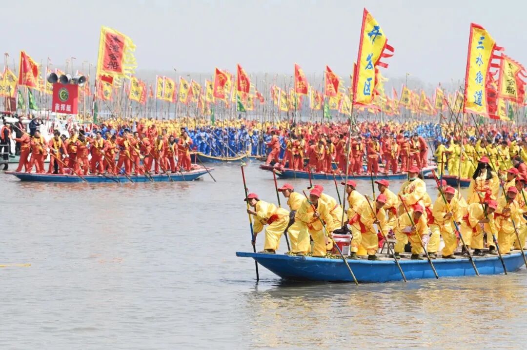 会船当天,百舸争流、千舟竞发,篙子船竹篙如林,划子船轻盈似燕,花船张灯结彩,贡船各显其妙,整个溱湖成为会船的海洋。
