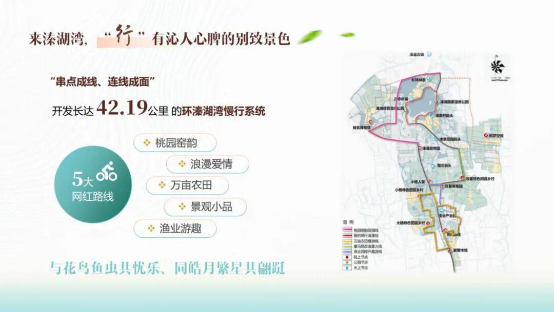 姜堰通过“串点成线、连线成面”,开发长达42.19 公里的环溱湖湾慢行系统,包含桃园窑韵、浪漫爱情、万亩农田、景观小品、渔业游趣5 大网红路线,随处可“与花鸟鱼虫共忧乐、同皓月繁星共翩跹”。如果您走累了,可以在 9 个特色驿站驻足歇脚、品尝小吃、露营拍照、休闲购物,感受“一站一景点”的多重快乐。
