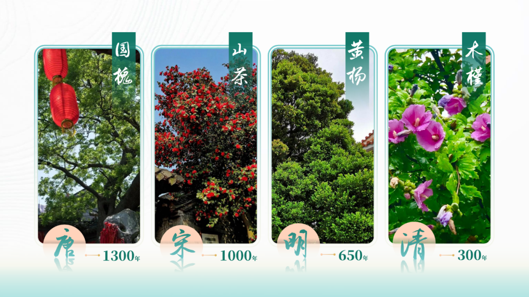 唐代国槐、宋代山茶、明代黄杨、清代木槿等枝繁叶茂