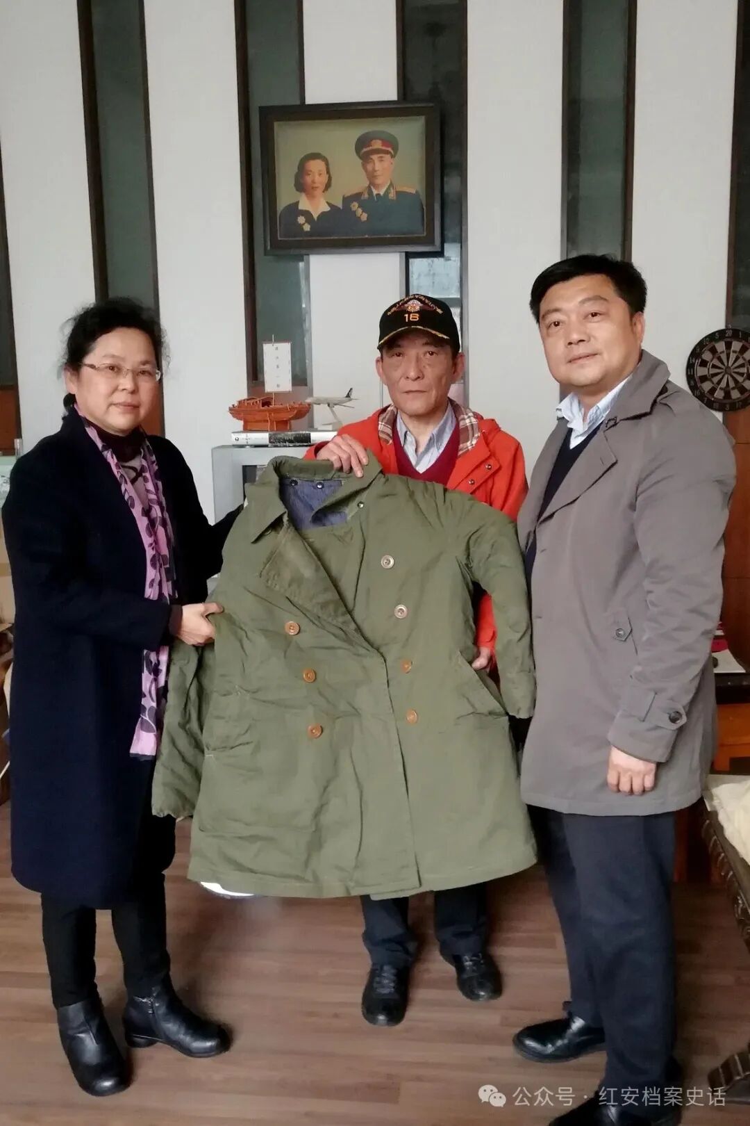 2018年11月21日,刘飞将军长子刘建华先生(中)向黄麻纪念园捐赠父亲穿过的棉大衣。右为湖北红安革命纪念地管理中心主任刘晓军。